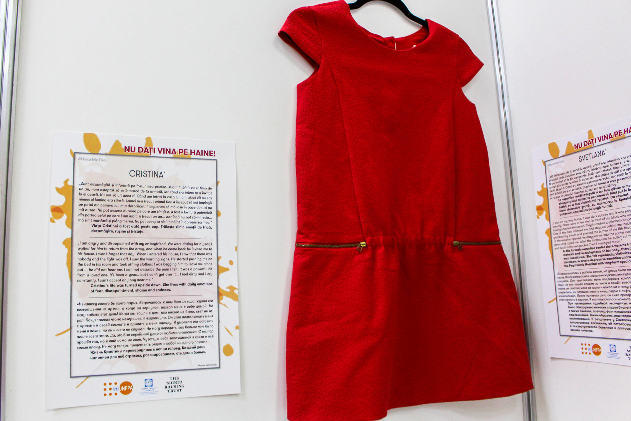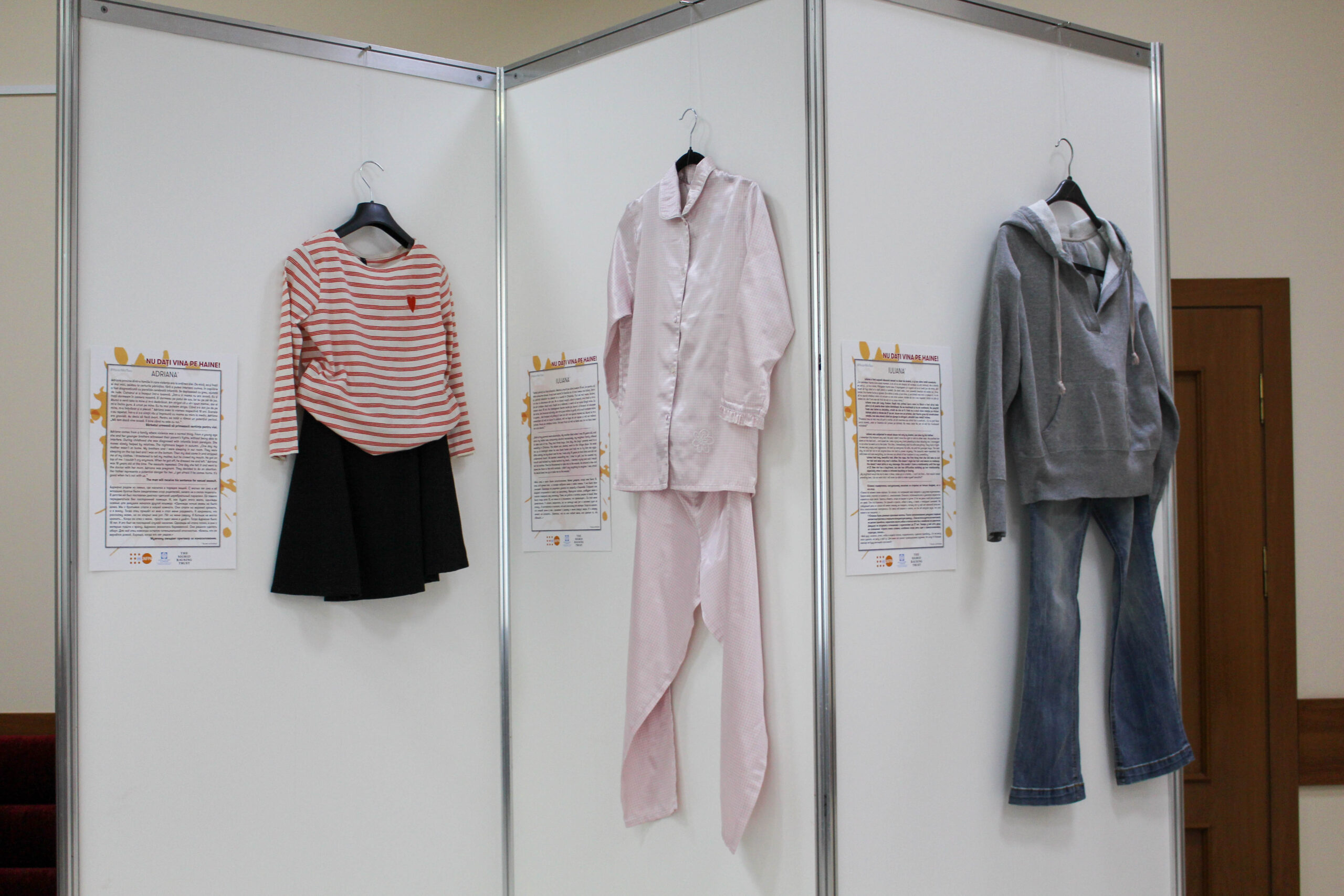 Chișinău, 29 noiembrie 2023 – Expoziția document cu genericul “Nu dați vina pe haine” prezintă hainele reconstituite ale nouă femei și fete adolescente din Republica Moldova, în momentul în care au fost abuzate sau hărțuite sexual. Expoziția amenajată în incinta Institutului Național al Justiției (INJ) în parteneriat cu Centrul de Drept al Femeilor și în colaborare cu UNFPA Moldova, atrage atenția asupra stereotipurilor din societatea noastră, care planează în jurul fenomenului violenței sexuale, având scopul să le combată.