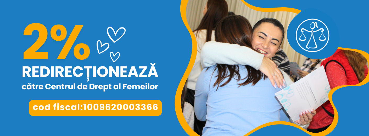 Alege să susții Centrul de Drept al Femeilor, astfel 2% din impozit vor merge direct către serviciile specializate pe care le oferim gratuit femeilor și fetelor afectate de violență. În anul 2024, la CDF s-au adresat 1198 victime ale violenței pentru a primi sprijinul specialiștilor.